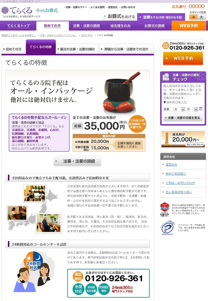 WEB集客型葬儀サービスご依頼件数No.1 (2011年 富士経済調べ)「小さなお葬式」の株式会社ユニクエスト・オンライン(本社:大阪市北区、代表取締役:田中 智也)は、この度、お布施・全国定額設定の寺院手配サイト『てらくる』を、法事・法要にまで寺院手配を拡充し、2012年9月13日(木)にリリースいたしました。