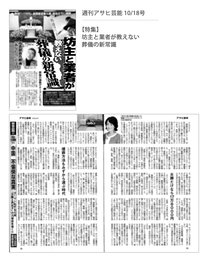 2012年10/18号(10月9日発売)の週刊アサヒ芸能「坊主と業者が教えない『葬儀の新常識』!」の特集記事(P93)に、「火葬だけなら17万8000円」という見出しで、小さなお葬式が取り上げられました。