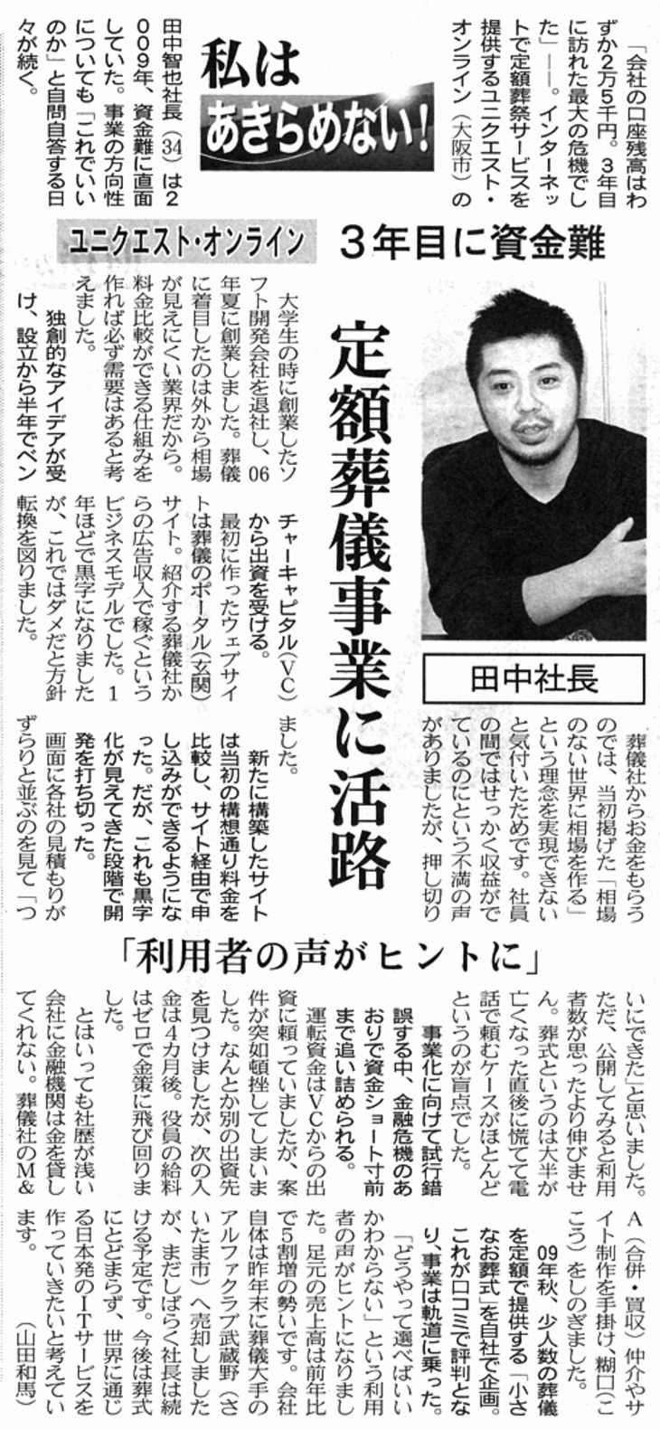 2013年5月29日の日経産業新聞に「定額葬儀事業に活路」という見出しで弊社代表が紹介されました。