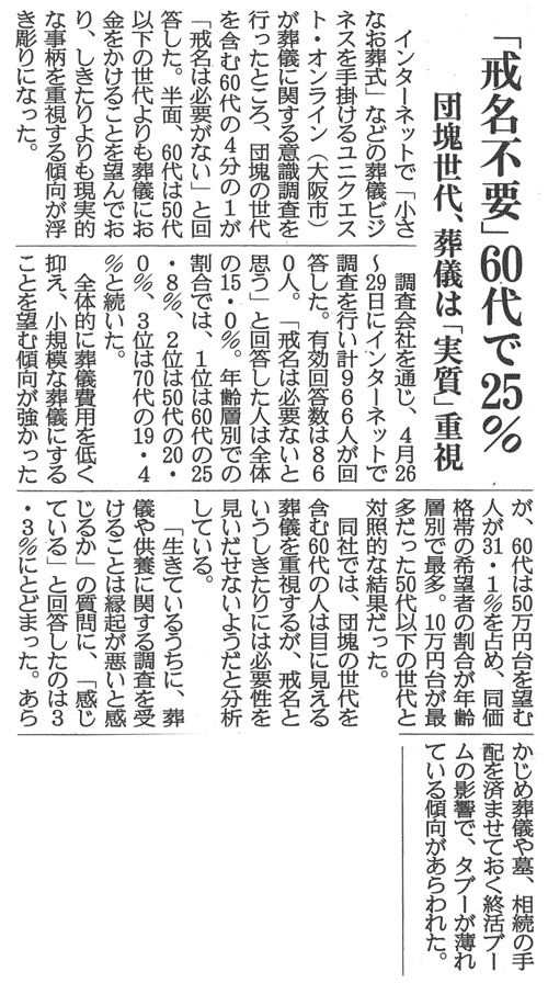 産経新聞(6月18日、西日本版)に「『戒名不要』60代で25% 団塊世代、葬儀は『実質』重視」という見出しで小さなお葬式の調査データが紹介されました。