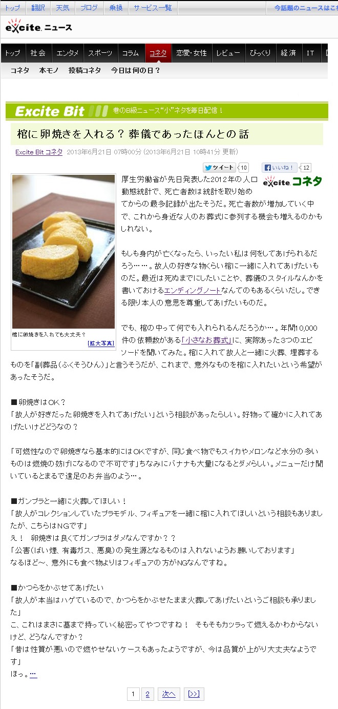 exiciteニュースに「棺に卵焼きを入れる?葬儀であったほんとの話」という見出しで小さなお葬式に関する話が紹介されました。