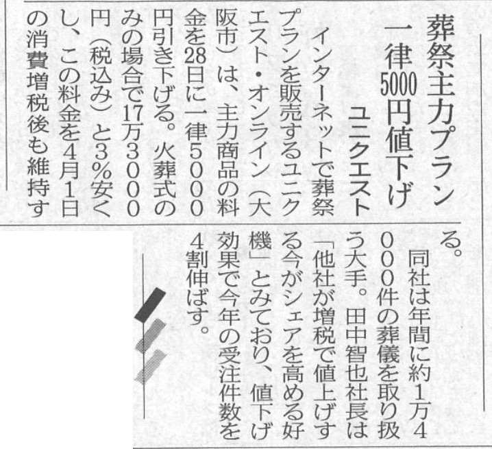 【見出し】「葬祭主力プラン 一律5000円値下げ」