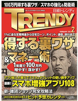 2013年2月号(1月4日発売)の日経トレンディ「得する裏ワザ&マネー術」特集内の「少人数での葬式は“格安低額”で行う 火葬のみなら僅か17万8,000円から」という見出しで、「小さなお葬式」「てらくる」「小さなお仏壇」が紹介されました。