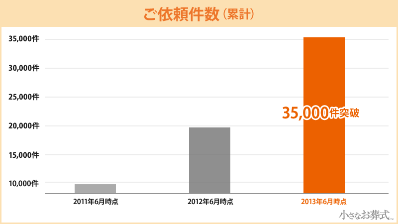 業界初の「全国対応」、「定額、追加料金不要」の定額プランを提示することでお客様の「明瞭価格の葬儀を安心して行いたい」というニーズと合致し、2009年10月サービススタートから2013年6月時点でご依頼件数が35,000件を突破。